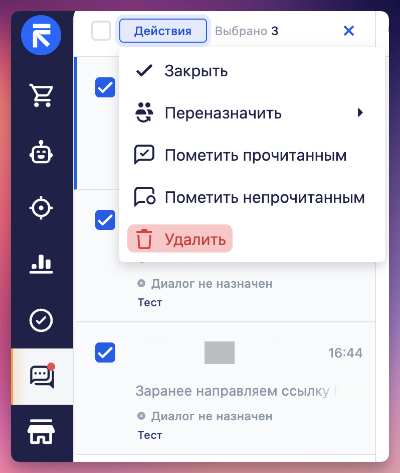 Для удаления диалогов/чатов из RetailCRM выберите нужные диалоги и через меню "Действия" нажмите кнопку "Удалить".