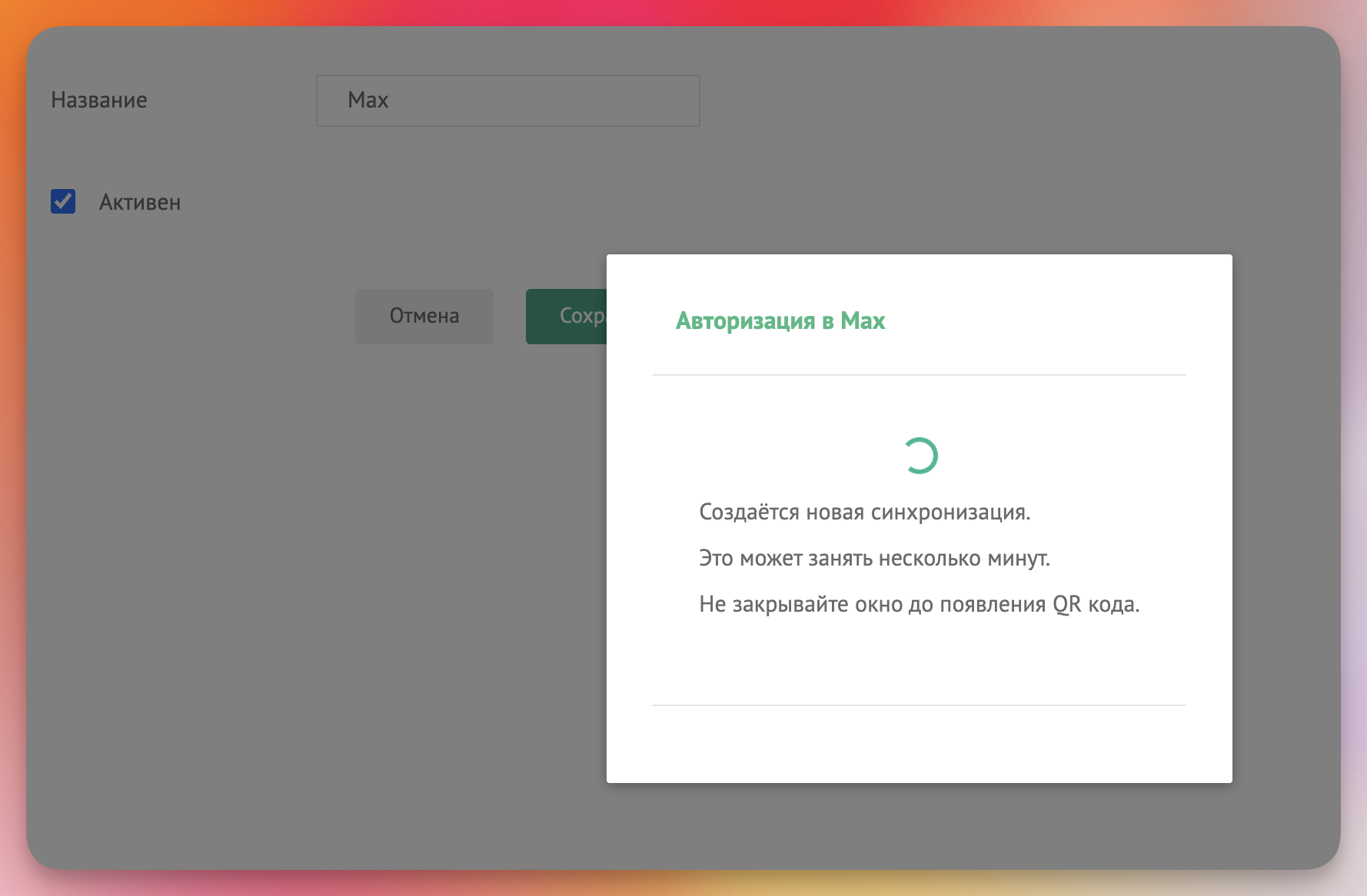 2. Укажите название канала (оно отобразится в RetailCRM) и добавьте аккаунт Max, появится окно авторизации: